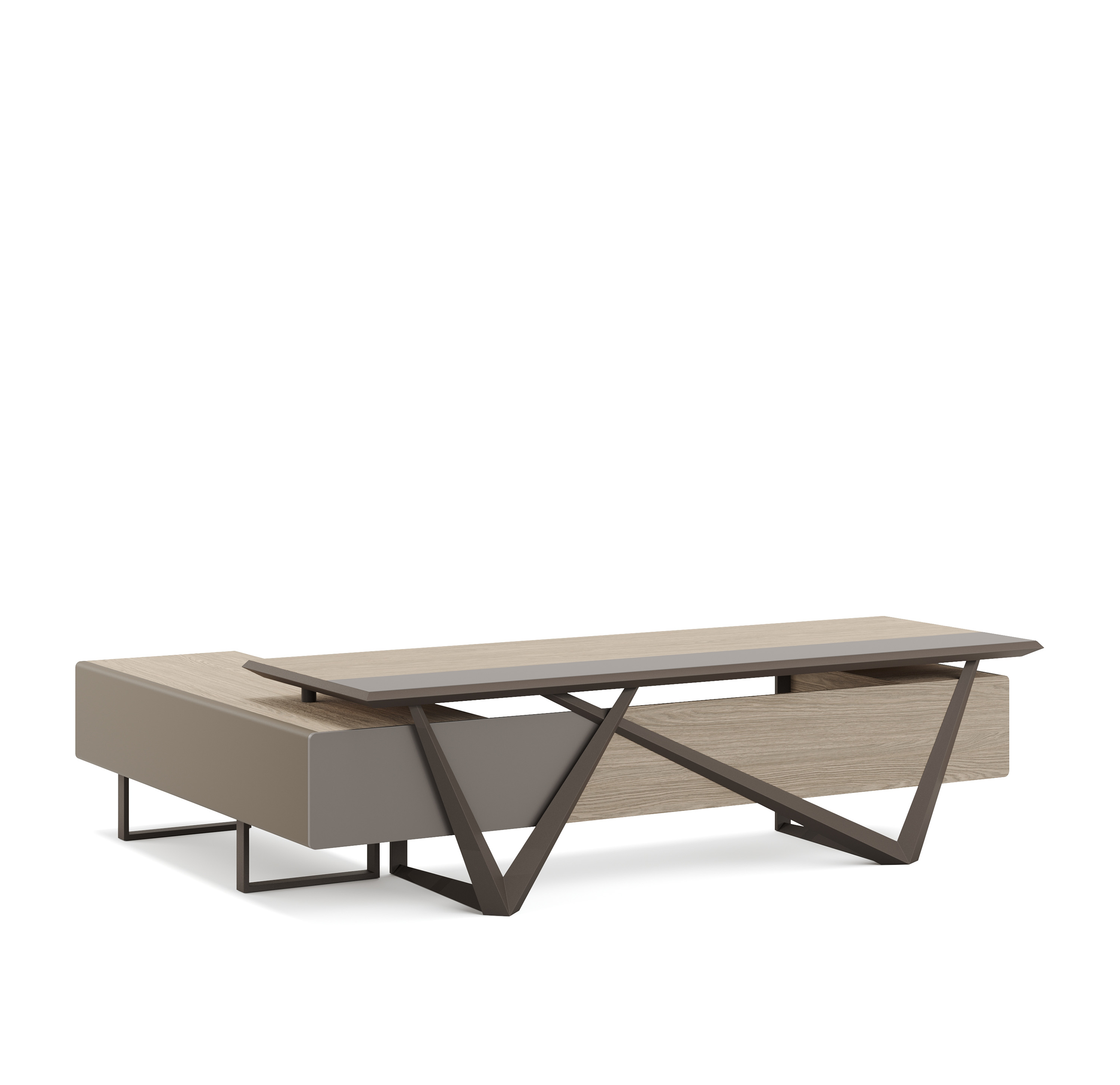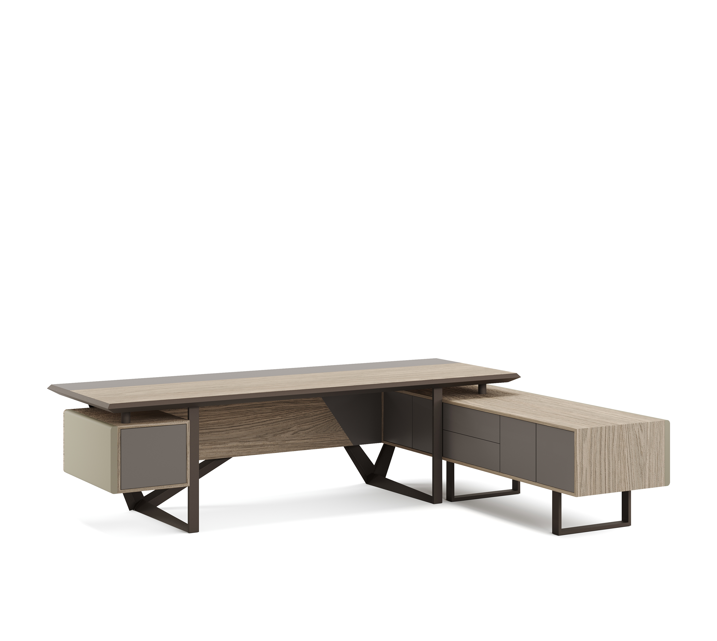 The Valens modern executive desk is a modern and versatile solution distinguished by its striking cross metal front detail. Enhanced with rear cabinet and side desk options, this design can be customized with various color and material combinations. Combining superior aesthetics and functionality, Valens is an ideal choice for high-level executive offices, supporting productivity and lasting quality.