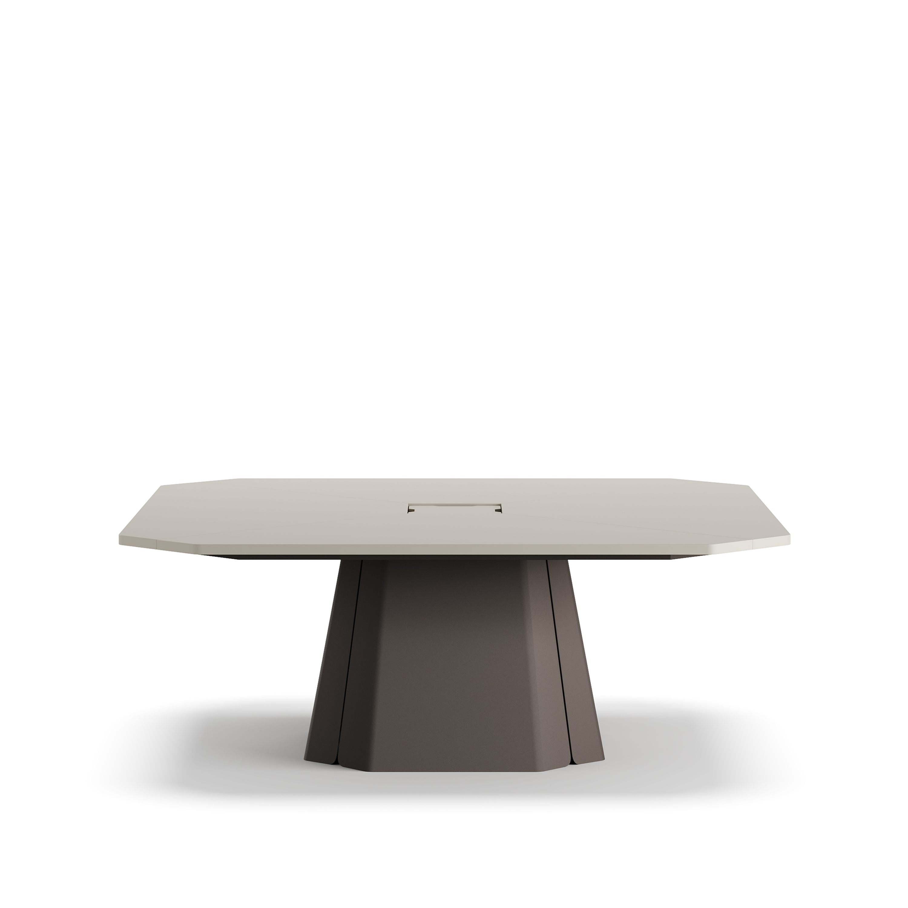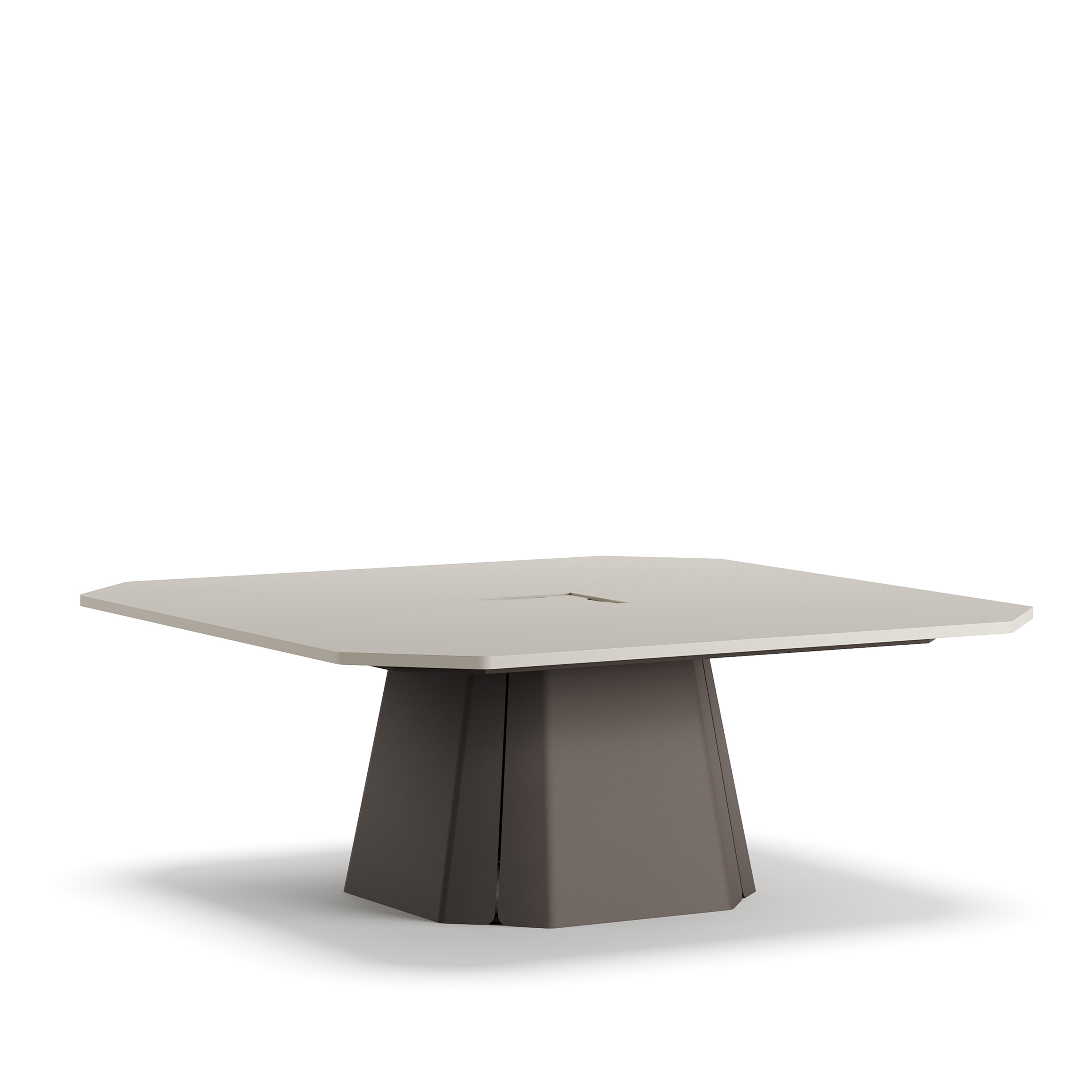 The Informatic sculptural conference table features a modern design highlighted by square prismatic totem columns at its corners. Its central structure, reaching up to 2×2 meters, offers premium collaborative solutions for large teams while being adaptable to project-specific needs with various color and material options. Ideal for shared workspaces, libraries, and modern offices, this versatile and striking design combines functionality and aesthetics, promising lasting quality.