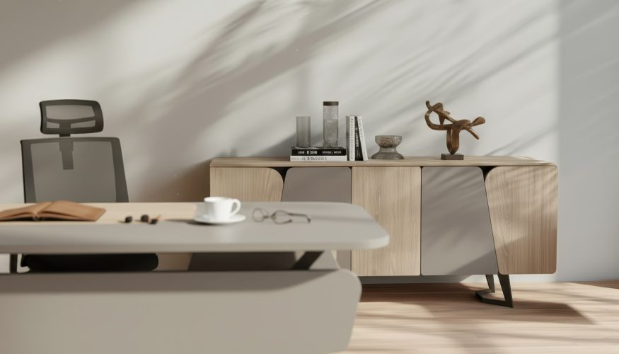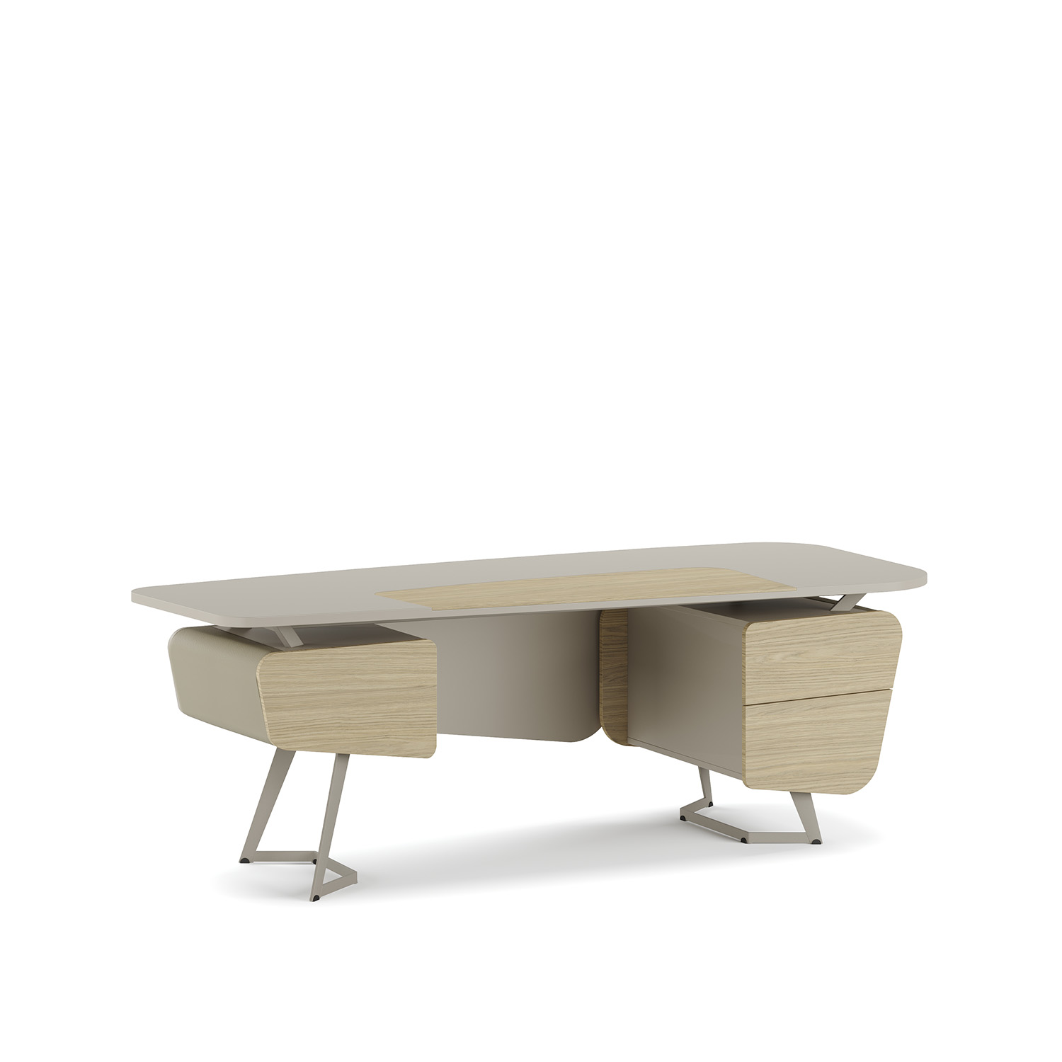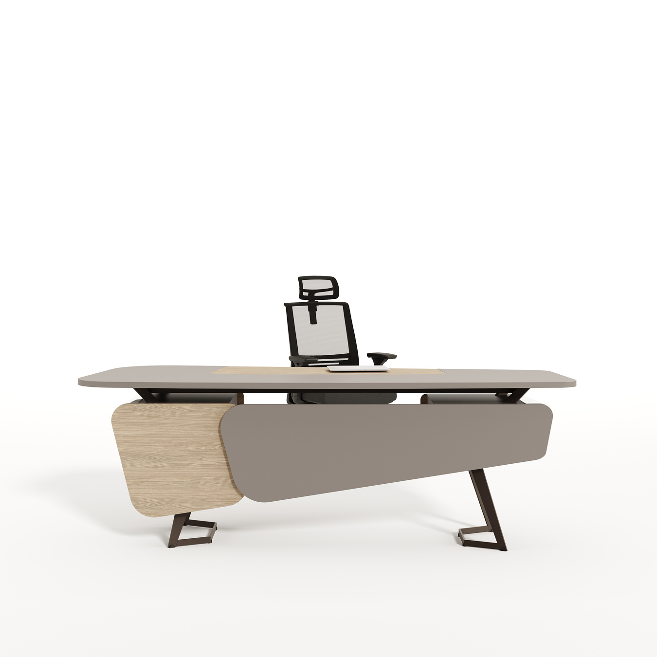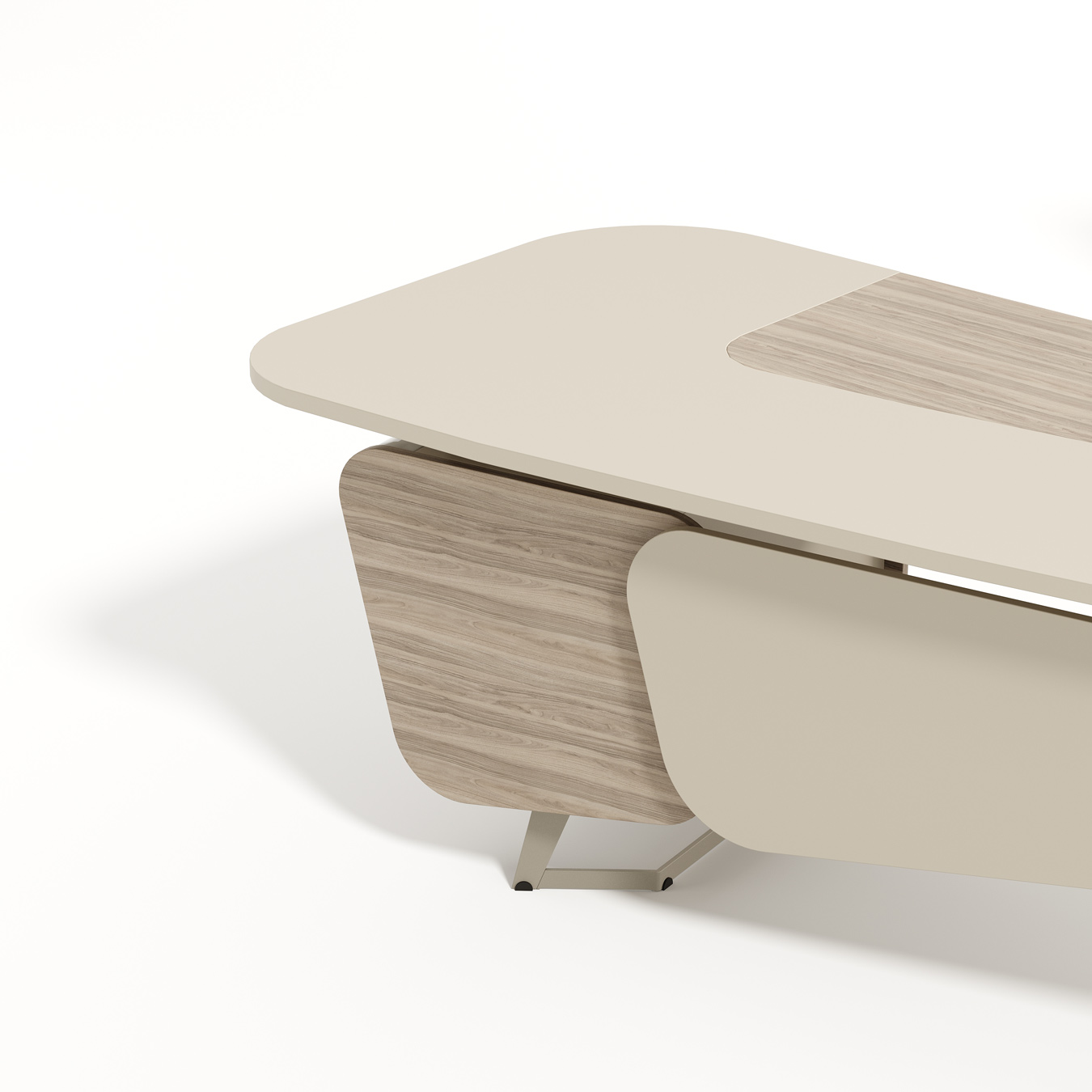 The Breeze modern executive desk is a premium solution that brings sculptural aesthetics to offices with its layered and elegant form. Featuring metal, panel, and faux leather details, this customizable piece adapts to various interior styles. Inspired by Zen and nature, it offers a simple, peaceful, and stylish workspace. With its human-centered design supporting employee well-being, this functional and aesthetic office desk is ideal for lasting quality and productivity.