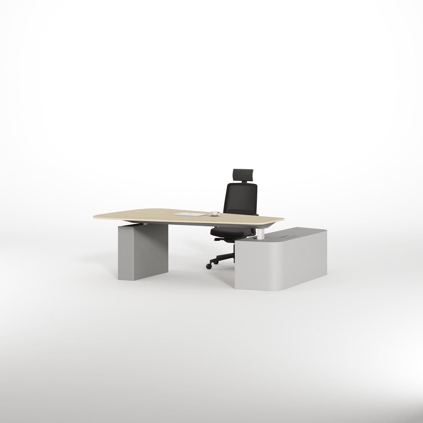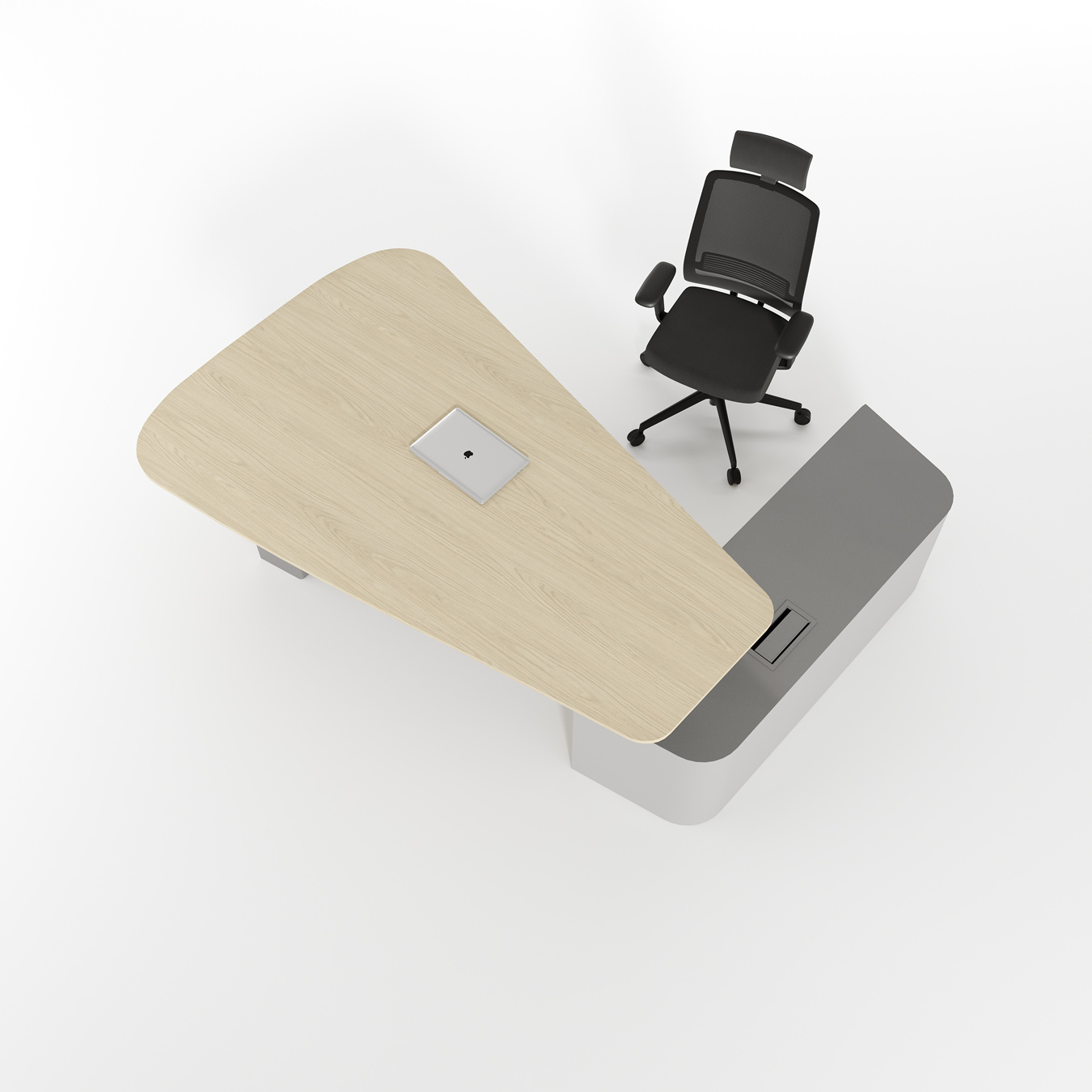 The Extrude executive desk offers a stylish and highly functional workspace for modern executives with its adjustable height and elegant design. Featuring a smart storage area hidden within its curved panel and a durable metal base, it enables an easy transition from personal desk organization to collaborative meeting settings. With a wide range of materials and color options for customization, this innovative office desk adds a modern and dynamic touch to any office, combining productivity with aesthetics.