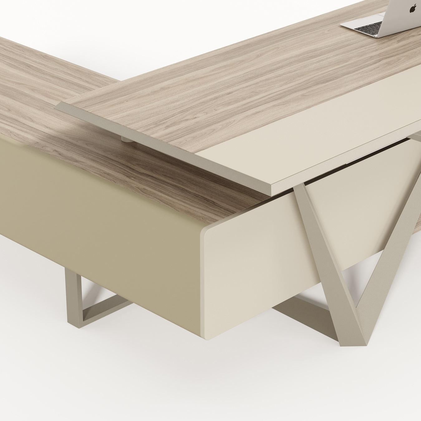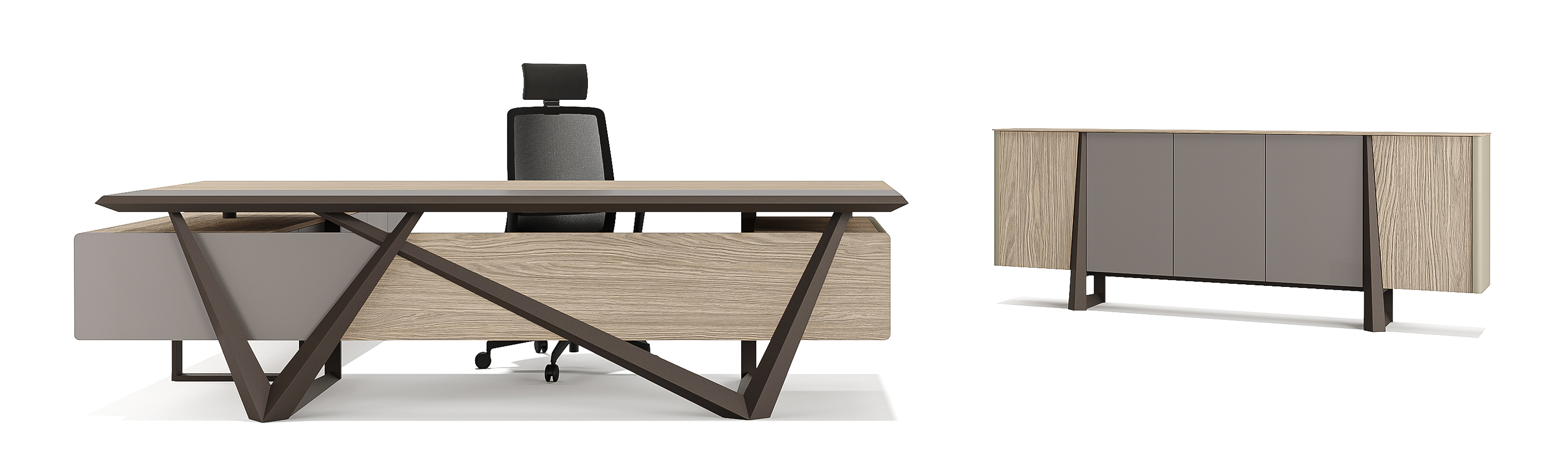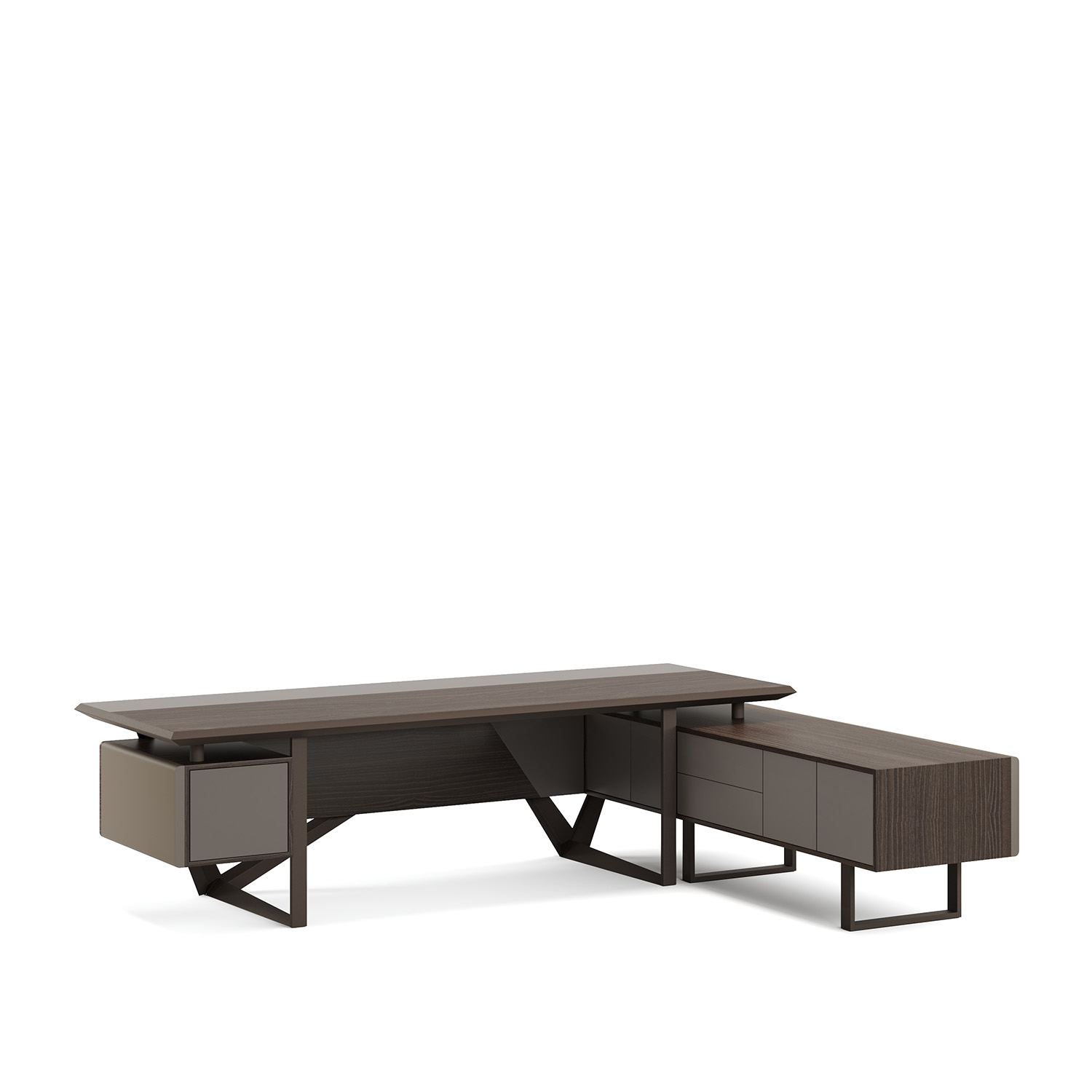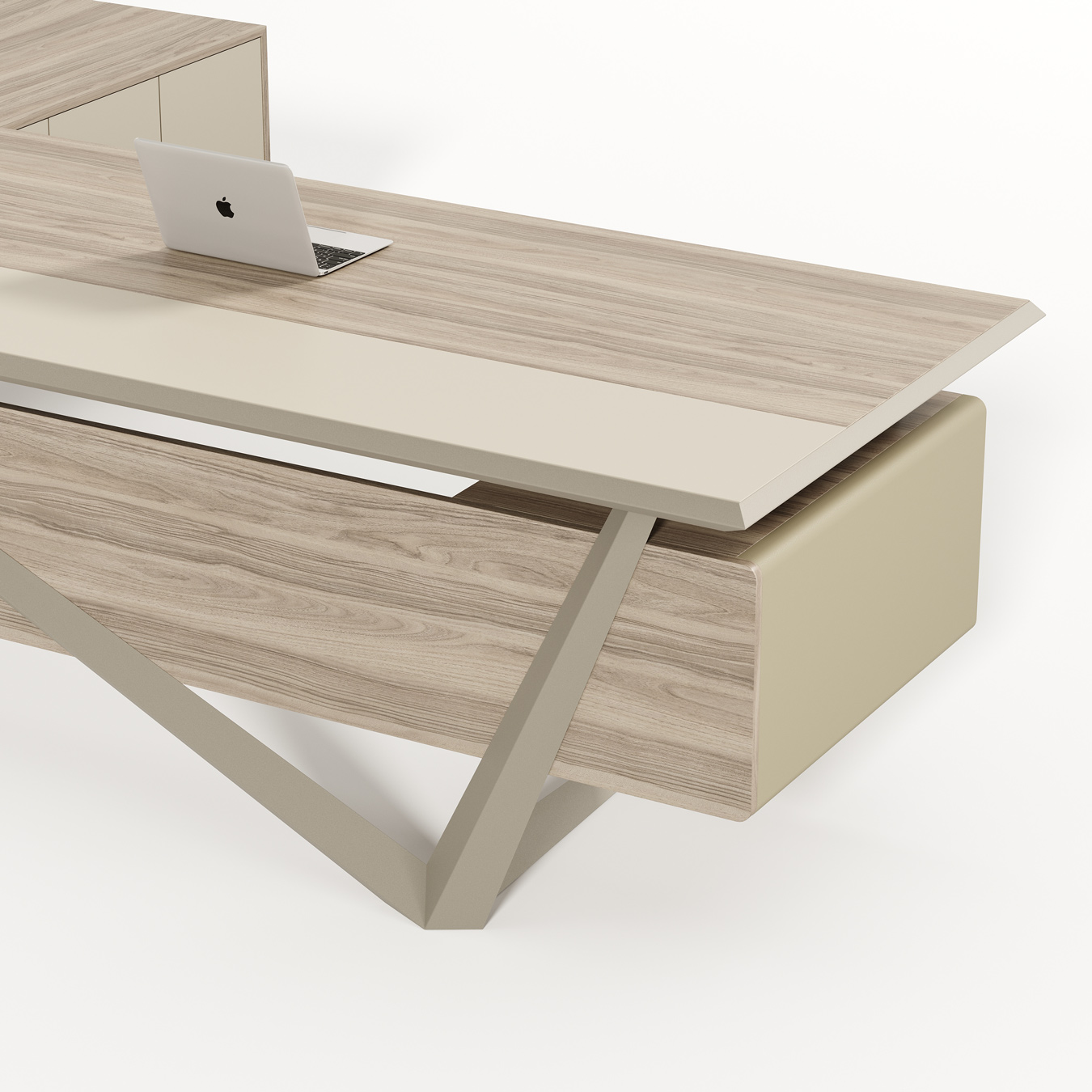 The Valens modern executive desk is a modern and versatile solution distinguished by its striking cross metal front detail. Enhanced with rear cabinet and side desk options, this design can be customized with various color and material combinations. Combining superior aesthetics and functionality, Valens is an ideal choice for high-level executive offices, supporting productivity and lasting quality.