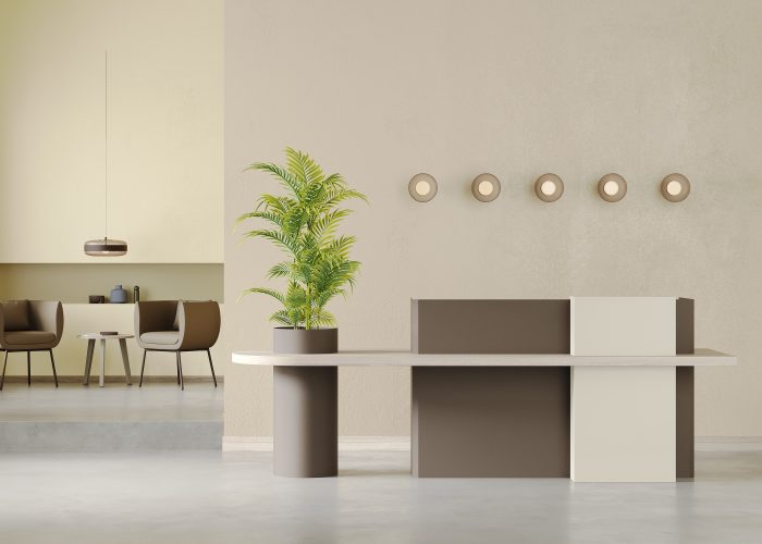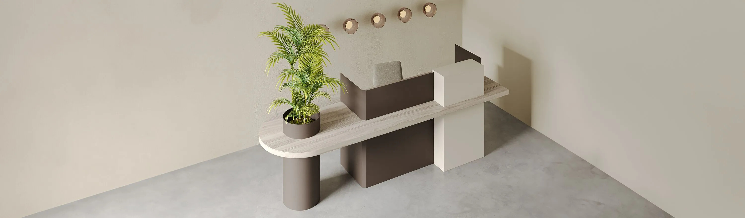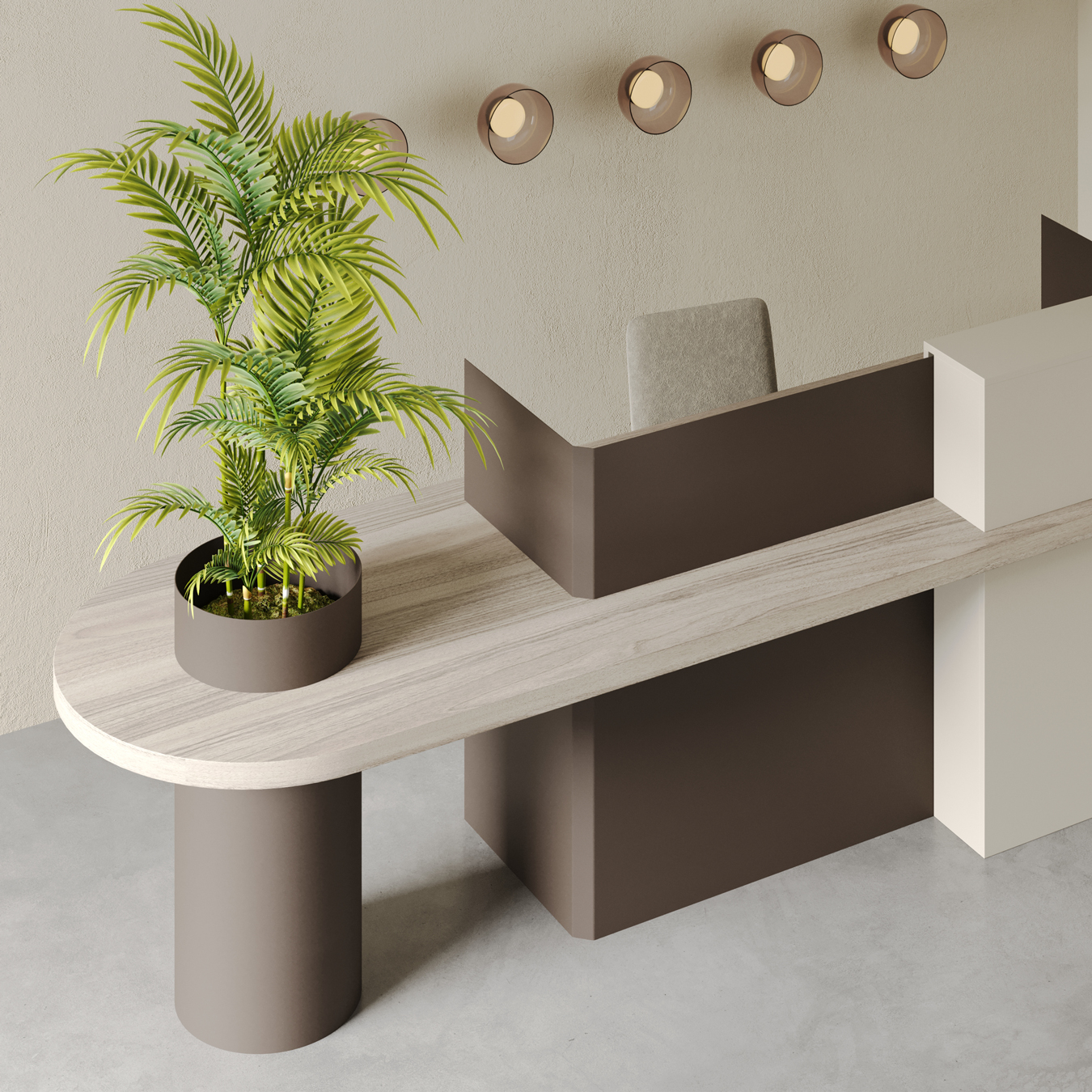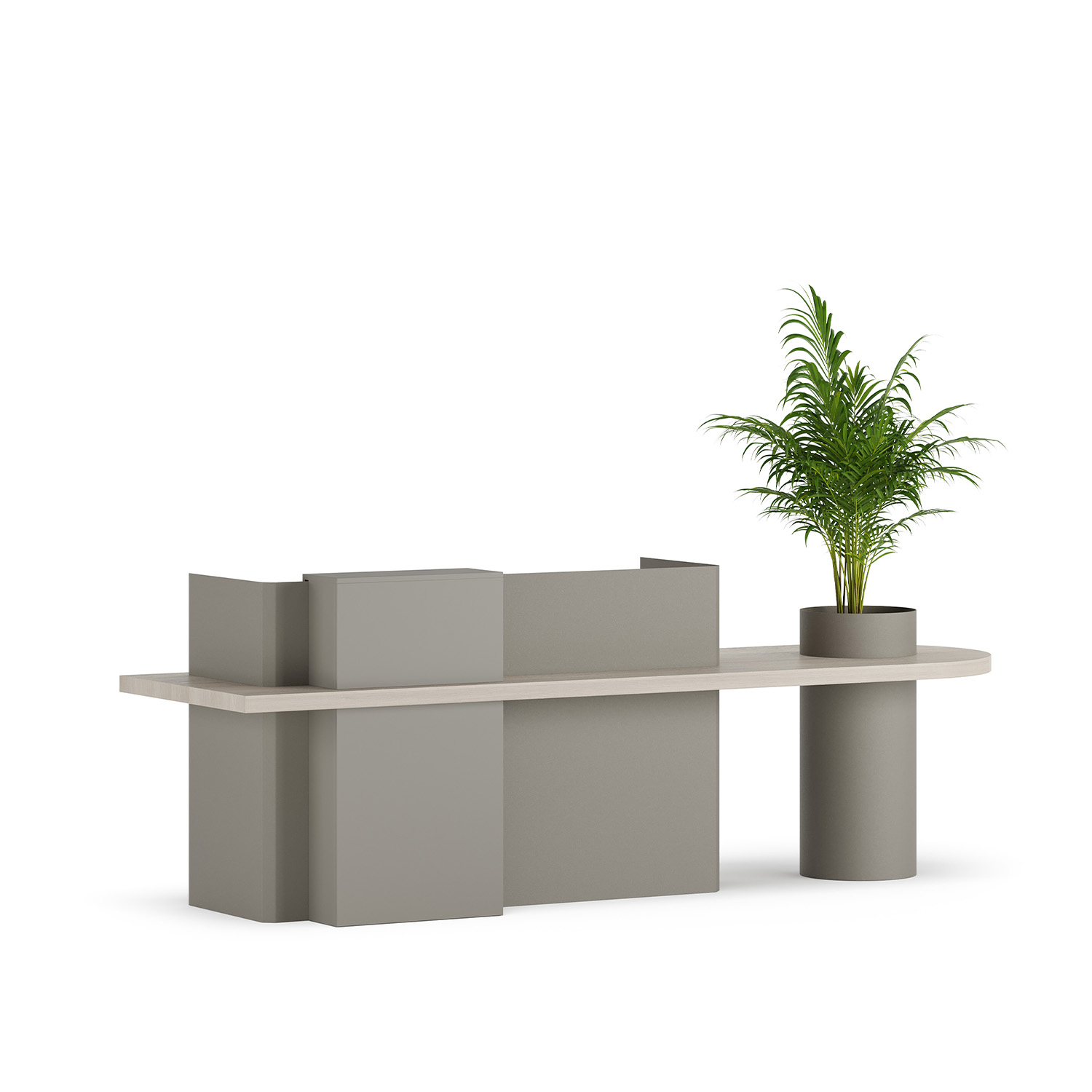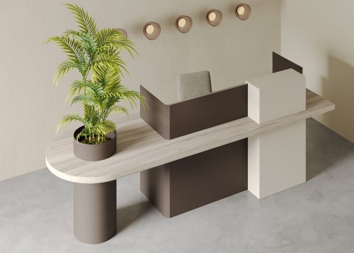 The Daisy modern reception desk stands out with its contemporary design lines and customizable features. Its asymmetrical form and integrated hidden greenery compartment create a warm and welcoming atmosphere in any space. This innovative reception counter combines aesthetics and functionality, making it an ideal solution for environmentally conscious workspaces.