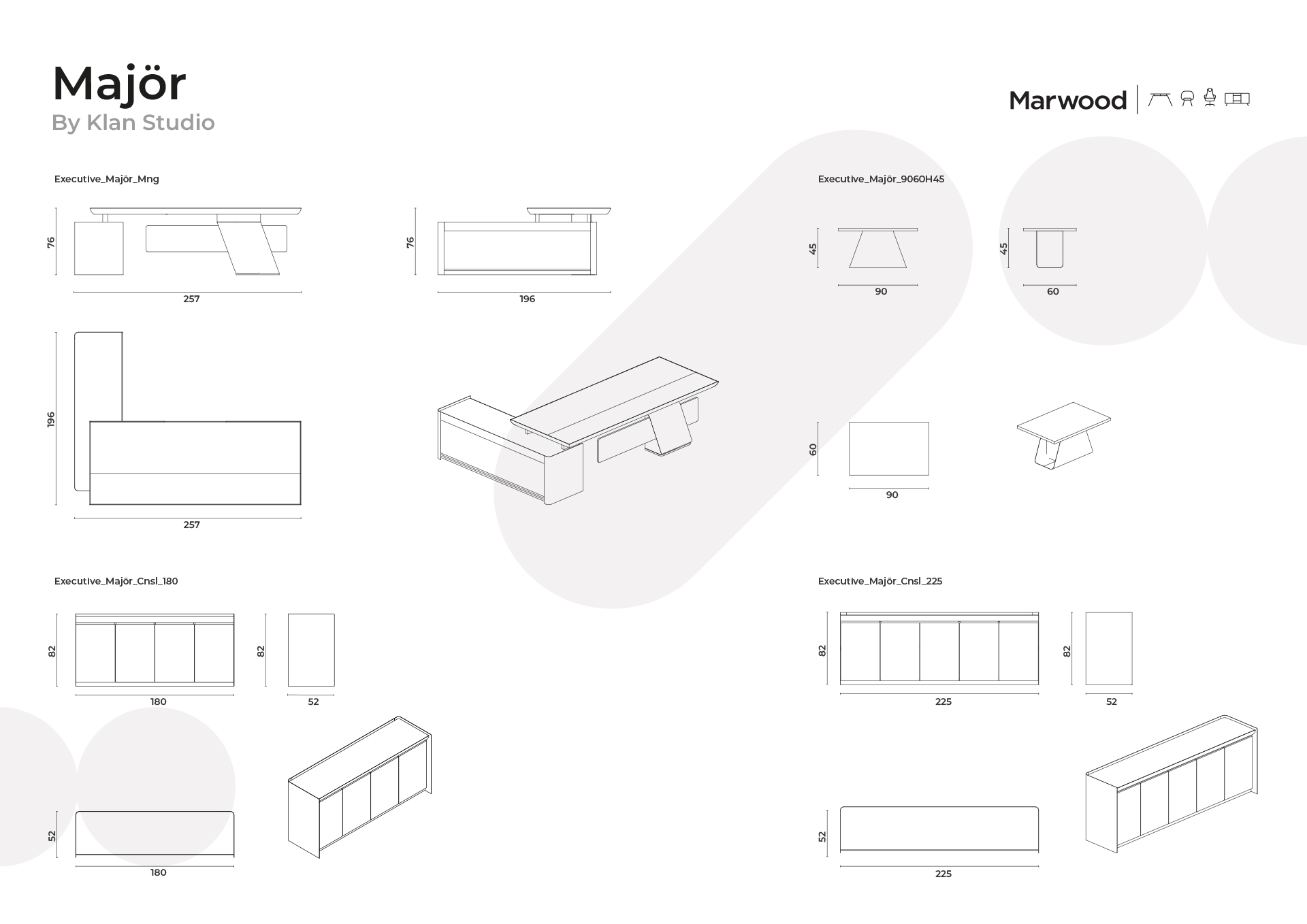 Major serisi modern yönetici mobilyaları, modern, zarif ve sade bir dengeyle yönetici odalarına özel olarak tasarlandı. Farklı malzeme ve yüzey katmanlarıyla zenginleşen estetik tasarımı, kişiselleştirilebilir renk ve dokularla özgünlük sunar. Yönetici masası, sehpa ve depolama üniteleri gibi modüler modelleriyle, şık ve üst düzey fonksiyonel bir ofis düzeni sağlayan bu yenilikçi seri, kalıcı kaliteyi ve üretken çalışma alanlarını destekler.