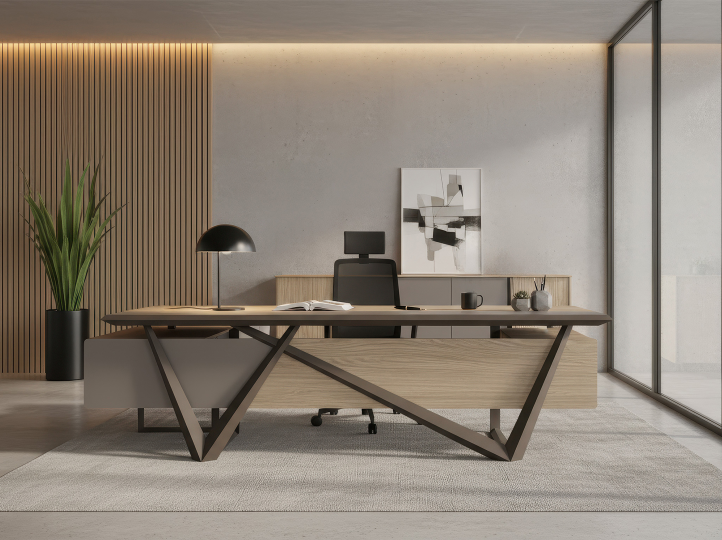 Valens modern yönetici masası, çapraz metal ön detayıyla dikkat çeken, modern ve çok yönlü bir çözümdür. Arka dolap ve yan masa seçenekleriyle zenginleştirilen bu tasarım, farklı renk ve malzeme kombinasyonlarıyla kişiselleştirilebilir. Üstün estetik ve işlevselliği bir arada sunan Valens, yüksek düzey yönetici ofisleri için ideal bir tercih olup, üretkenliği ve kalıcı kaliteyi destekler.